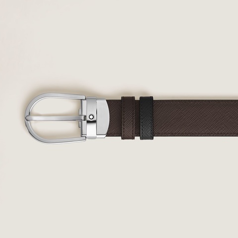 Ощутите сдержанную элегантность с этим двусторонним кожаным ремнем шириной 30 мм. Изготовленный из тисненой кожи классического черного цвета с одной стороны и изысканного оттенка эбенового дерева с другой, ремень дополнен утонченной пряжкой в ​​форме подковы с блестящим палладиевым покрытием, которая идеально дополнит как формальный, так и повседневный образ.
